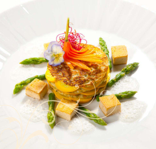 Die Zucchini in dünne Streifen schneiden, in Olivenöl weich dünsten und würzen, rosettenförmig zwischen die Pfannkuchen legen und zu einem kleinen Tör tchen stapeln. Den gekochten Spargel und die gebratenen Tofuwürfel darum legen und mit Rote Beete-Sprossen garnieren.