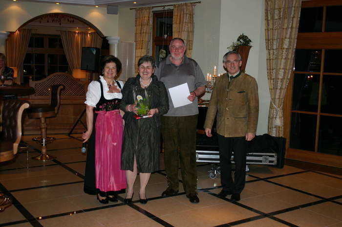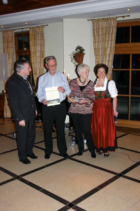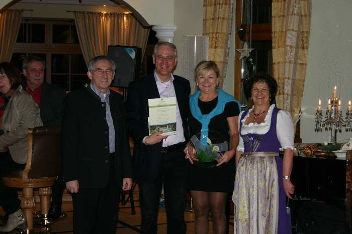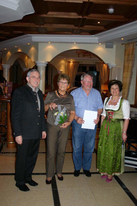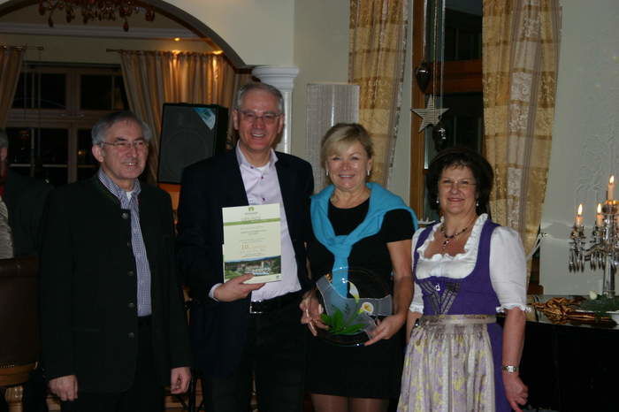 Anita und Anton Holzer bedanken sich mit einem Glaspräsent und einer Urkunde bei Claus und Kriemhild Gohl aus Stuttgart für den 20. Aufenthalt im Mooshof