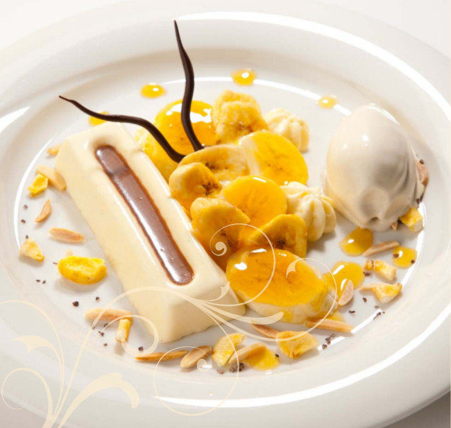 Die Milch mit dem ausgekratzten Vanillemark und der Banane aufkochen, pürieren und etwas abkühlen lassen (unter 70°). Zucker und Eigelb mit einem Schneebesen schaumig rühren, mit der Milch vermengen und „zur Rose abziehen“, d.h. unter ständigem Rühren über Wasserdampf auf 78°C erhitzen. Die vorher eingeweichte Gelatine gut ausgedrückt unter die