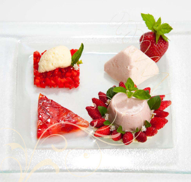 Die ausgelöste Gelatine schmelzen, mit Weißwein, Zucker und geschnittenen Erdbeeren vermengen und in eine mit Klarsichtfolie ausgelegte Form gießen. Für 5 bis 6 Stunden