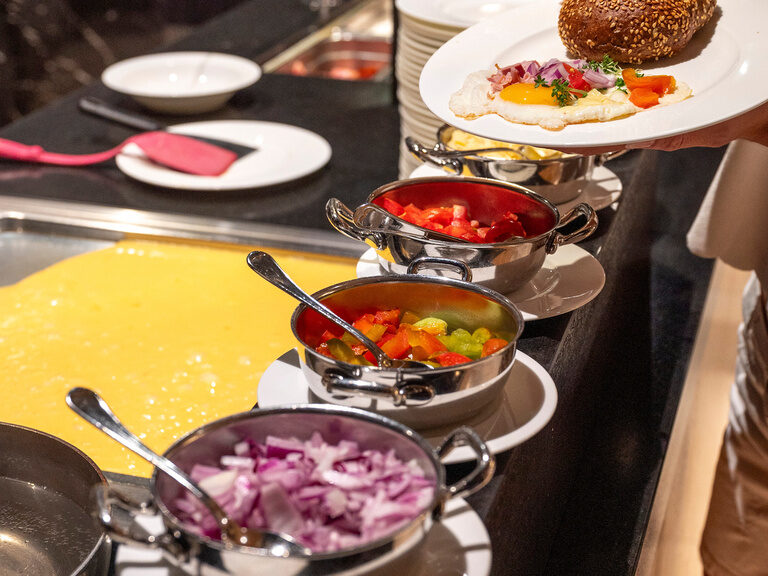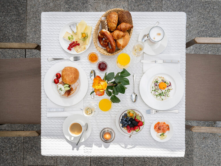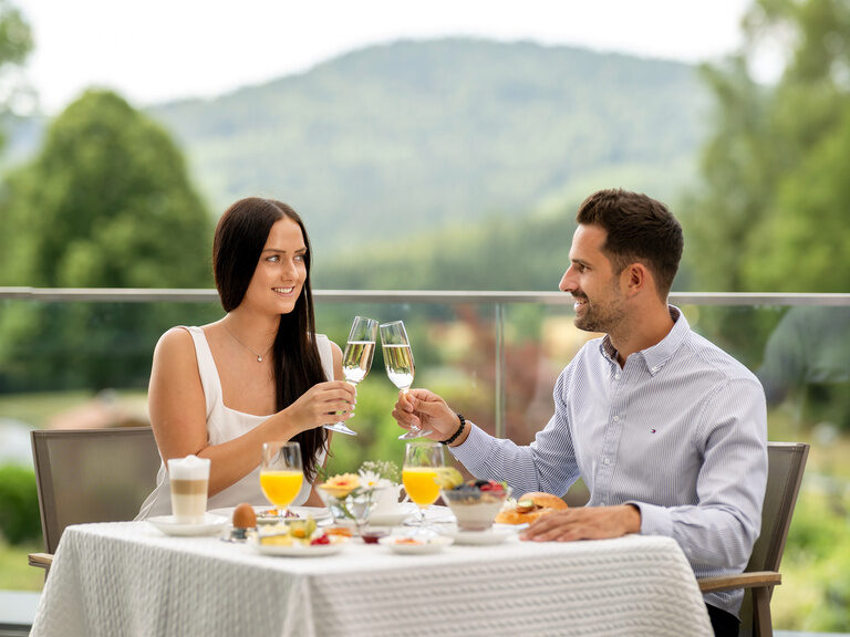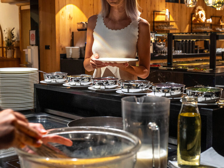 Der großzügige Buffetbereich im Hotel Mooshof präsentiert sich modern, großzügig und mit dunkler Eleganz. Hier beginnt jeder Tag Ihres Wellnessurlaubs im Bayerischen Wald mit einem Frühstücksbuffet, das keine Wünsche offenlässt: frisches Brot und Gebäck, regionale Käse- und Wurstspezialitäten, fruchtige Marmeladen, knuspriges Müsli, Obst, frische Säfte, kleine deftige Frühstücksschmankerl und warme Eierspeisen, die direkt vor den Augen der Gäste zubereitet werden. Besonders geschätzt wird die große Auswahl an frischen Produkten aus Bayern und der Region, die für echten Genuss und Qualität stehen. Auch für Gäste mit besonderen Vorlieben oder Ernährungswünschen bietet das Frühstücksbuffet im Hotel Mooshof eine abwechslungsreiche Vielfalt – von leichten Vitalgerichten bis hin zu süßen Köstlichkeiten. Im stilvollen Ambiente des neuen Buffetbereichs mit seiner eleganten Ausstattung genießen Gäste eine große Auswahl und viel Raum zum Entdecken. Das Frühstück im Mooshof macht jeden Urlaub in Bayern zu einem genussvollen Erlebnis.