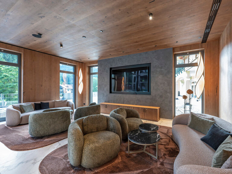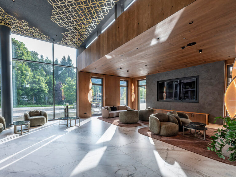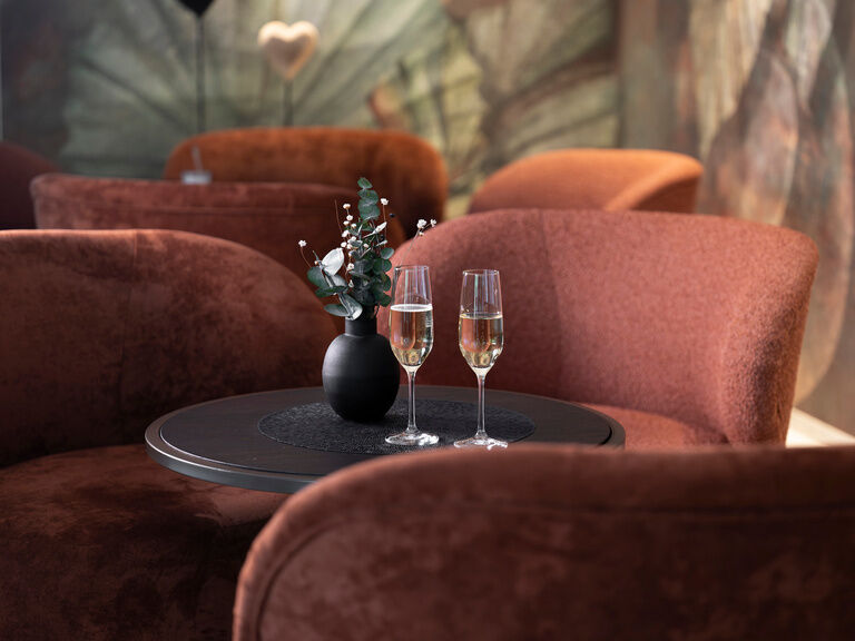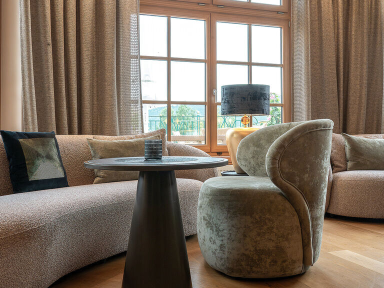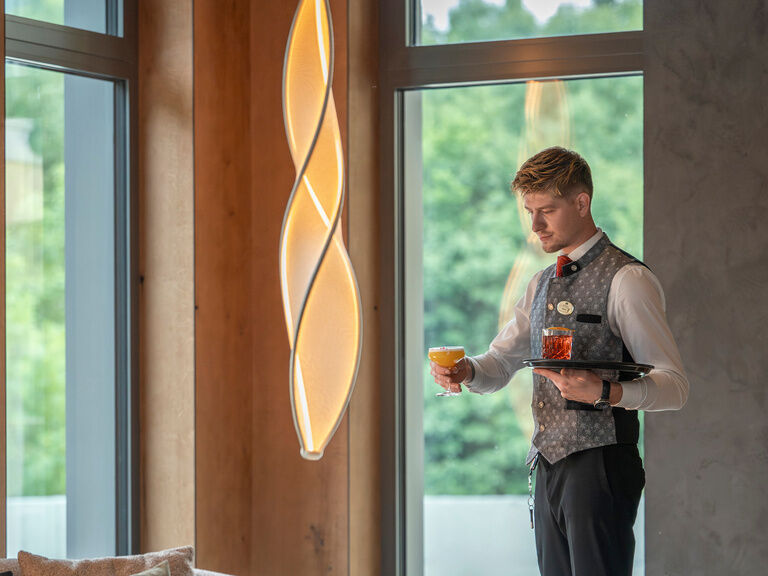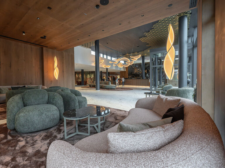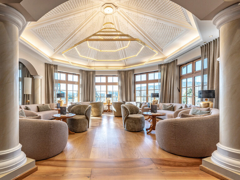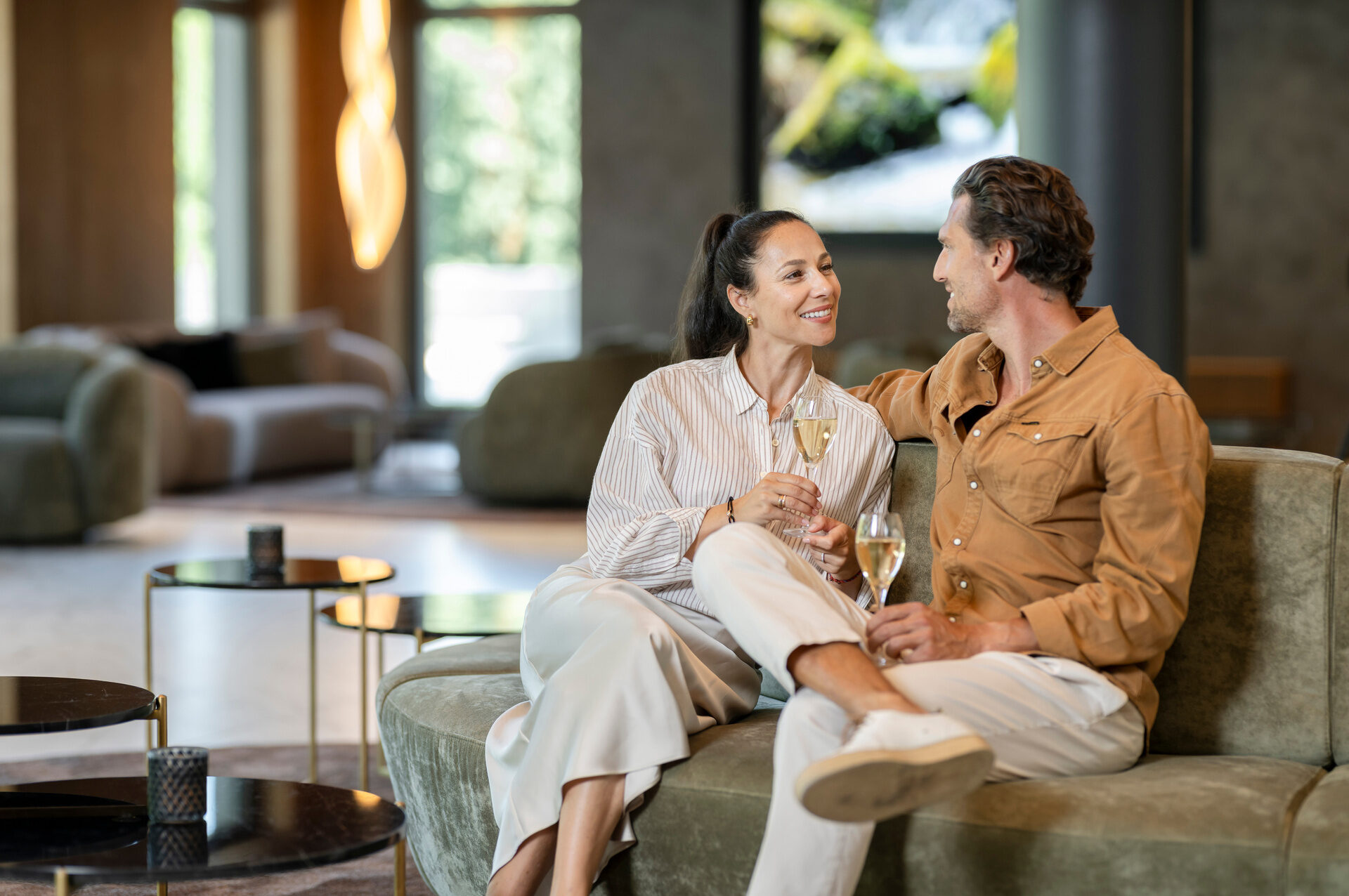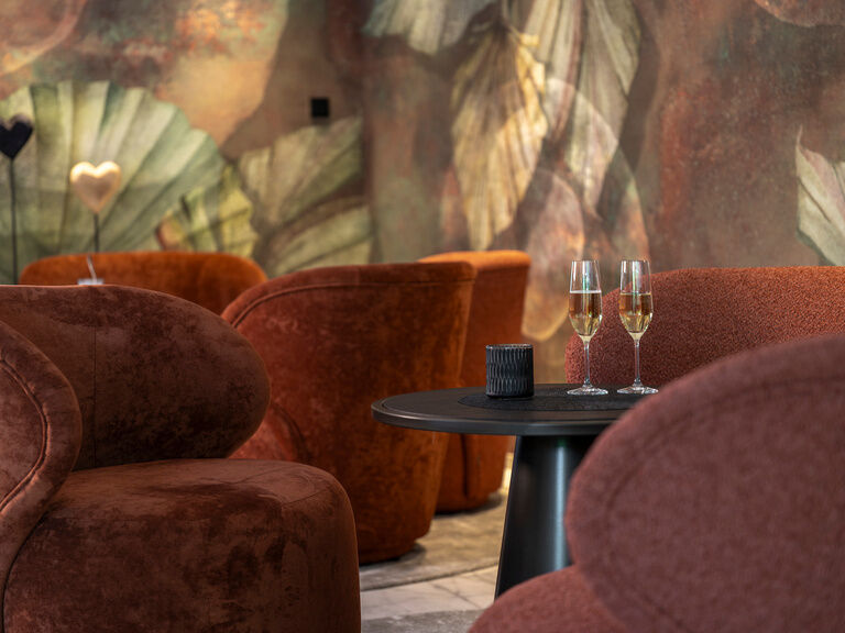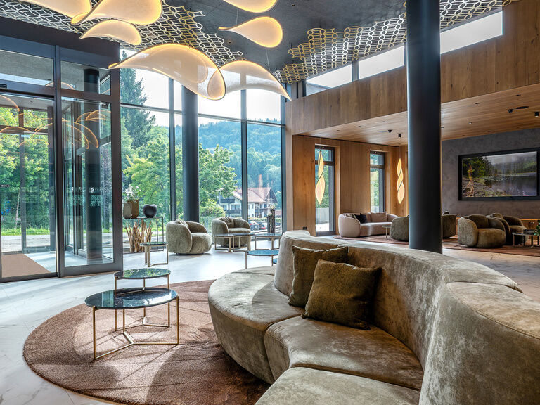 Im Hotel Mooshof im Bayerischen Wald erwarten Gäste gleich mehrere exklusive Loungebereiche, die den Aufenthalt zu einem besonderen Erlebnis machen. In der neuen roten Chill-Lounge schaffen edle Polstermöbel und eine kunstvolle Tapete mit großen Blattmotiven eine ausdrucksstarke Atmosphäre voller Stil und Eleganz. Die Empfangslounge mit ihrem geschwungenen Sofa im Zentrum der Hotelhalle sowie einer separaten Sitzgruppe bietet den perfekten Ort zum Ankommen und Durchatmen – mit viel Raum, Ausblick und moderner Technik. Ein echtes Highlight ist die Sofalounge: neu möbliert, wohnlich-elegant und gekrönt von einem imposanten, modernen Kronleuchter, der dem Raum eine unvergleichliche Ausstrahlung verleiht. Ob als Treffpunkt, Rückzugsort oder stilvolles Ambiente für den Aperitif – die Loungebereiche des Mooshof laden dazu ein, Ihren Wellnessurlaub in Bayern in einer besonders entspannten und zugleich exklusiven Atmosphäre zu genießen.