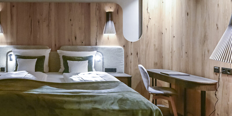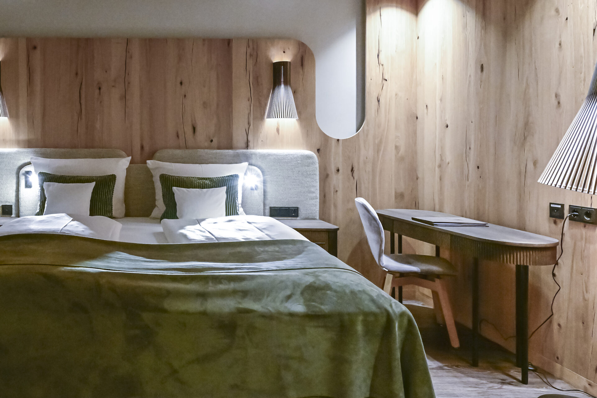 Doppelzimmer mit Wohnecke, Badezimmer mit Dusche, WC, teils mit Parkettboden, Südbalkon, unterschiedliche Möblierungen (Zirben-, Eichen-, Ahornmöbel)