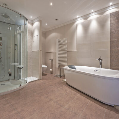 - Badezimmer mit freistehender Badewanne und Dusche