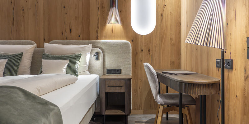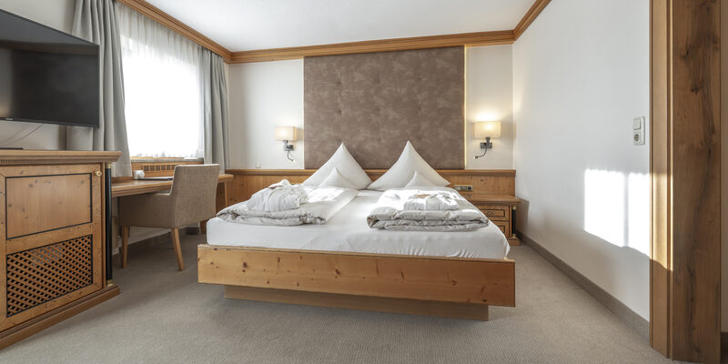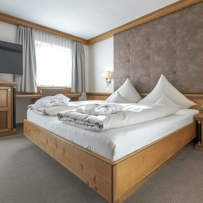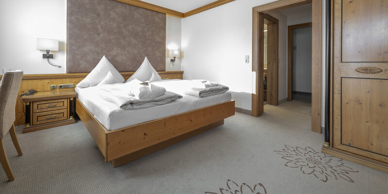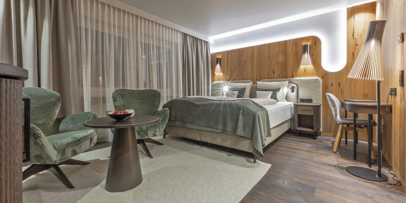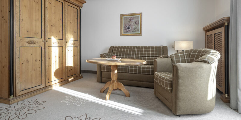 Doppelzimmer mit Wohnecke, Badezimmer mit Dusche, WC, teils mit Parkettboden, Südbalkon, unterschiedliche Möblierungen (Zirben-, Eichen-, Ahornmöbel)