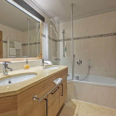 Juniorsuite mit Wohn- und Schlafzimmer, Badezimmer mit Dusche, Badewanne, Doppelwaschtisch, separates WC
